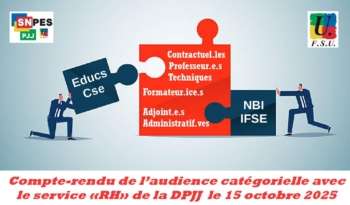 Compte-rendu de l’audience catégorielle avec le service des «Ressources humaines» de la DPJJ le 15 octobre 2025 chaton2025-12-03T15:01:33+01:003 décembre 2025|Catégories : à la une, ACTUALITÉS, DROITS DES PERSONNELS, Nationales| Partagez cet article ! FacebookXEmail Articles similaires SNES-FSU et SNUipp-FSU majoritaires aux élections professionnelles des psychologues de l’Éducation nationale SNES-FSU et SNUipp-FSU majoritaires aux élections professionnelles des psychologues de l’Éducation nationale 3 décembre 2017 Demo-Élections présidentielles : pas une voix pour le Front national ! Demo-Élections présidentielles : pas une voix pour le Front national ! 24 avril 2017 Demo-Mercredi 8 mars, journée internationale des droits des femmes. Demo-Mercredi 8 mars, journée internationale des droits des femmes. 6 mars 2017 Demo-Appel collectif pour l’avenir des lycées professionnels Demo-Appel collectif pour l’avenir des lycées professionnels 20 juin 2016