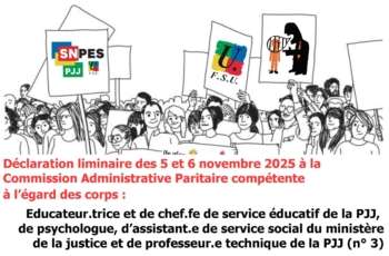 Déclaration liminaire des 5 et 6 novembre 2025 à la Commission Administrative Paritaire compétente à l’égard des corps, d’éducateurice et de chef.fe de service éducatif de la protection judiciaire de la jeunesse, de psychologue, d’assistant.e de service social du ministère de la justice de professeur.e technique de la protection judiciaire de la jeunesse (n° 3)