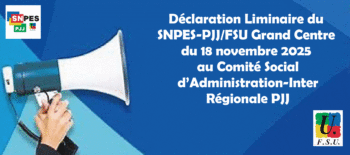 Déclaration Liminaire du SNPES-PJJ/FSU Grand Centre en date du 18 novembre 2025 au Comité Social d’Administration-Inter Régionale PJJ (CSA-IR) chaton2025-11-21T17:20:56+01:0021 novembre 2025|Catégories : Locales| Partagez cet article ! FacebookXEmail