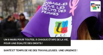 Un 8 Mars pour toutes, à chaque étape de la vie, pour une égalité des droits ! Santé et temps de vie des travailleuses : une urgence ! snpespjjadmin2026-03-05T23:35:41+01:004 mars 2026|Catégories : à la une, ACTUALITÉS, DROITS DES PERSONNELS, Nationales| Santé et temps de vie des travailleuses : une urgence ! Partagez cet article ! FacebookXEmail Articles similaires SNES-FSU et SNUipp-FSU majoritaires aux élections professionnelles des psychologues de l’Éducation nationale SNES-FSU et SNUipp-FSU majoritaires aux élections professionnelles des psychologues de l’Éducation nationale 3 décembre 2017 Demo-Élections présidentielles : pas une voix pour le Front national ! Demo-Élections présidentielles : pas une voix pour le Front national ! 24 avril 2017 Demo-Mercredi 8 mars, journée internationale des droits des femmes. Demo-Mercredi 8 mars, journée internationale des droits des femmes. 6 mars 2017 Demo-Appel collectif pour l’avenir des lycées professionnels Demo-Appel collectif pour l’avenir des lycées professionnels 20 juin 2016